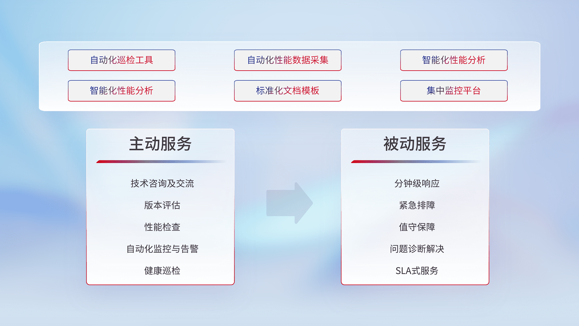 智能化工具和标准化文档,,,,保障服务质量,,,提供主动服务(包含技术咨询、、、、版本评估、、性能检查、、、自动化监控与告警、、、、健康巡检)和被动服务包含(分钟级响应、、、、紧急排障、、值守保障、、问题诊断解决、、、SLA服务)。。。。
