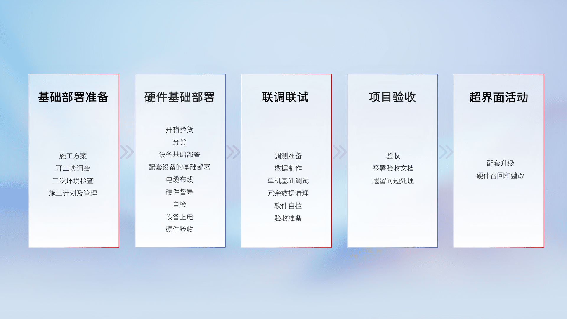 从基础部署准备、、硬件基础部署、、、、联调联试、、、项目验收、、、越界面活动的全过程可追溯,,保证施工质量和进度。。